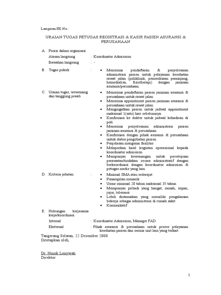 Uraian Tugas Kasir Rawat Inap. Uraian Tugas Petugas Registrasi Rawat Jalan Pasien Asuransi. Uraian Tugas Rumah Sakit.